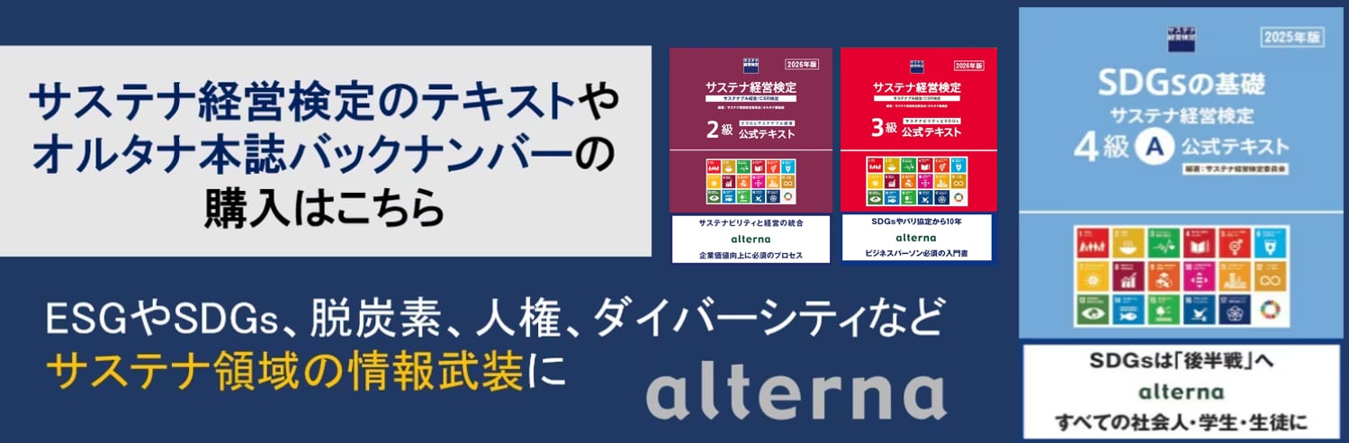 ※「サステナ経営検定2級公式テキスト2026年版」の「学割」ページです。大学生が対象です。社会人大学院生は対象外です。購入する際には所属大学が発行したメールアドレスの登録をお願いします。 ※商品は、週に一回発送作業を致します。郵便局のスマートレターで、ポストインです。ご発送通知からお届けまで、一週間ほど掛かりますことをご了承下さい(追跡機能はございません)。 ※ご注文は1回ごとに1名様×1冊ずつ注文して下さい(設定送料の関係で、2冊以上の同梱は承りかねます)。 ※お届け先がご勤務先の場合、お名前欄かご住所欄に『社名』をご入力願います。社名がなく、宛先不明でお届けできない事がよくございます。また、マンションにお住まいの場合は建物名とお部屋番号を入力して下さい。 2026年5月、11月に実施予定の「サステナ経営検定」(サステナブル経営/CSR検定)2級試験は、このテキストから出題されます。 目次 ◆ 序 章 「サステナ経営」の定義と意義 森 摂(株式会社オルタナ代表取締役 創刊編集長) 第1章: サステナ経営/ESG/SDGs/CSRを学ぶ 1-1 : なぜサステナ経営が重要なのか 森 摂(株式会社オルタナ代表取締役 創刊編集長) 1-2 : サステナ経営に求められる思考と行動 森 摂(株式会社オルタナ代表取締役 創刊編集長) 1-3 : 世界のサステナビリティの流れ 森 摂(株式会社オルタナ代表取締役 創刊編集長) 1-4 : 欧州のサステナビリティ戦略 下田屋 毅(サステイナビジョン代表取締役) 1-5 : 日本のサステナビリティの流れ 大喜多 一範(株式会社Future Vision代表取締役) 1-6 : 中小企業のサステナブル経営 影山 摩子弥(横浜市立大学名誉教授) 1-7 : ソフトローからハードローへ 森 摂(株式会社オルタナ代表取締役 創刊編集長) 1-8 : 「パーパス」(存在意義)の重要性 森 摂(株式会社オルタナ代表取締役 創刊編集長) 1-9 : グリーンウォッシュ (オルタナ編集部) 第2章: ESGの重要イシュー 2-1 : ESG総論 荒井 勝(Federated Hermes EOS 上級顧問) 2-2 : E: 脱炭素への流れ 池原 庸介(オルタナ総研フェロー) 2-3 : E: サーキュラーエコノミー (公益財団法人世界自然保護基金ジャパン) 2-4 : E: 生物多様性/水資源の保全 足立 直樹(株式会社レスポンスアビリティ代表取締役) 2-5 : S: ビジネスと人権 佐藤 暁子(弁護士) 2-6 : S: DEIとジェンダー課題 堀江 敦子(スリール株式会社代表取締役) 2-7 : G: コーポレートガバナンスの基礎(2026年版追加) 松田 千恵子(東京都立大学大学院経営学研究科教授) 2-8 : G: コーポレートガバナンス・コード 後藤 敏彦(NPO法人 サステナビリティ日本フォーラム理事特別顧問) 2-9: 取締役会/報酬等委員会の在り方 花井宏介(三菱UFJリサーチ&コンサルティング株式会社コンサルティング事業本部組織人事ビジネスユニットHR第2部マネージャー) 2-10: 人的資本経営とは 大喜多 一範(株式会社Future Vision代表取締役) 2-11:ESGと金融界の動き 荒井 勝(Federated Hermes EOS 上級顧問) 2-12:留意すべきESG評価 岸上 有沙(日本サステナブル投資フォーラム理事) 2-13 : 米国における「反ESG」の動き 荒井 勝(Federated Hermes EOS 上級顧問) 第 3 章 サステナビリティ/CSRを経営に統合する 関 正雄(損保ジャパン カルチャー変革推進部シニアアドバイザー) 3-1 : サステナ経営(マネジメント)の考え方 3-2 : サステナ経営の「ビジョン」「システム」「教育」 3-3 : マテリアリティの特定 3-4 : サステナ指標の設定とインパクト評価 3-5 : ダイアログとエンゲージメント 第 4 章 ステークホルダー目線の重要性 冨田 秀実(一般社団法人サステナビリティ経営研究所代表理事) 4-1 : 重要なステークホルダーの視点 4-2 : サステナ経営/CSRにおけるNGO/NPOの役割 4-3 : NGO/NPOによる企業評価 4-4 : 消費者の役割/エシカル消費/サステナブル消費 4-5 : 株主・投資家としての責任 第 5 章 サステナビリティの情報開示/ レポーティング 5-1 : 統合報告 関 正雄(損保ジャパン カルチャー変革推進部シニアアドバイザー)、中畑 陽一(オルタナ総研フェロー) 5-2 : 統合報告の国際的な流れと日本国内の動き(オルタナ編集部) 5-3 : GRI 冨田 秀実(一般社団法人サステナビリティ経営研究所代表理事)、中畑 陽一(オルタナ総研フェロー) 5-4 : CSRDとESRS 中畑 陽一(オルタナ総研フェロー) 5-5 : 統合報告書で開示すべき16の非財務情報 室井 孝之(オルタナ総研フェロー)
